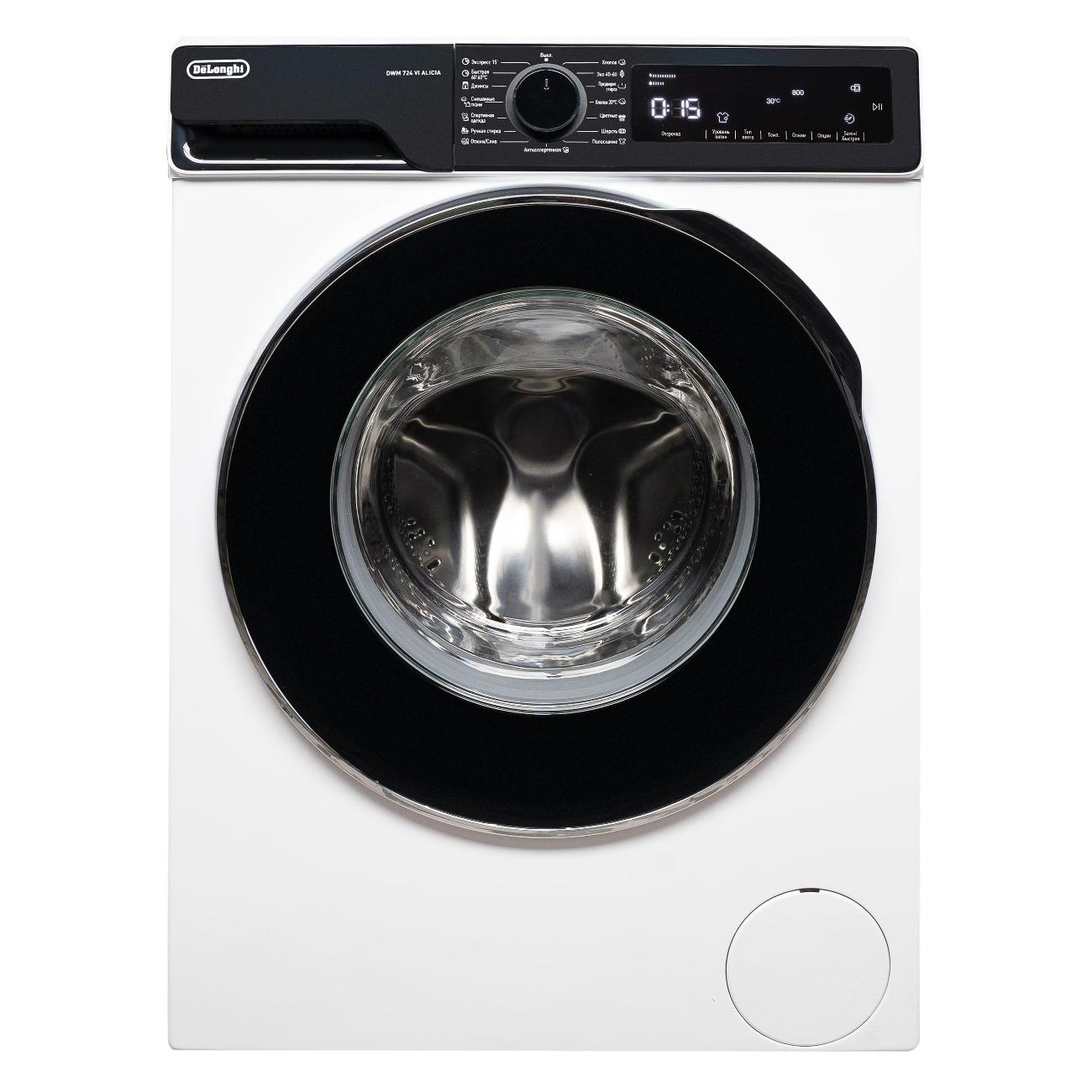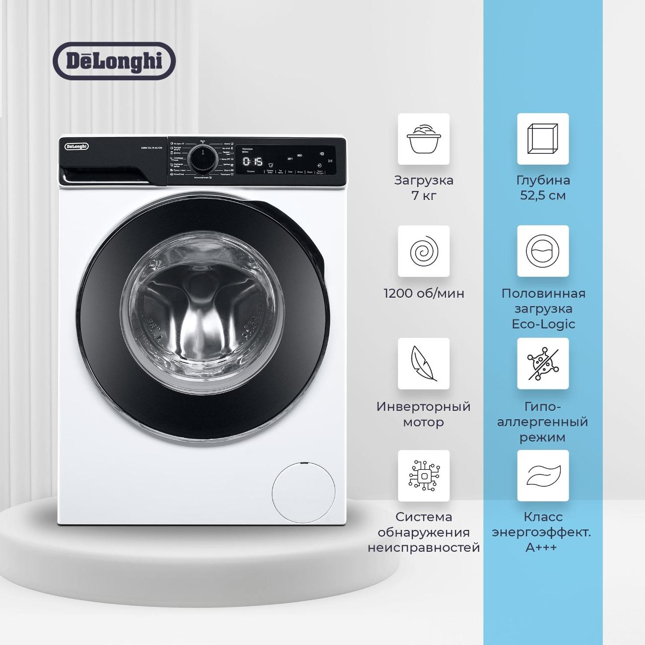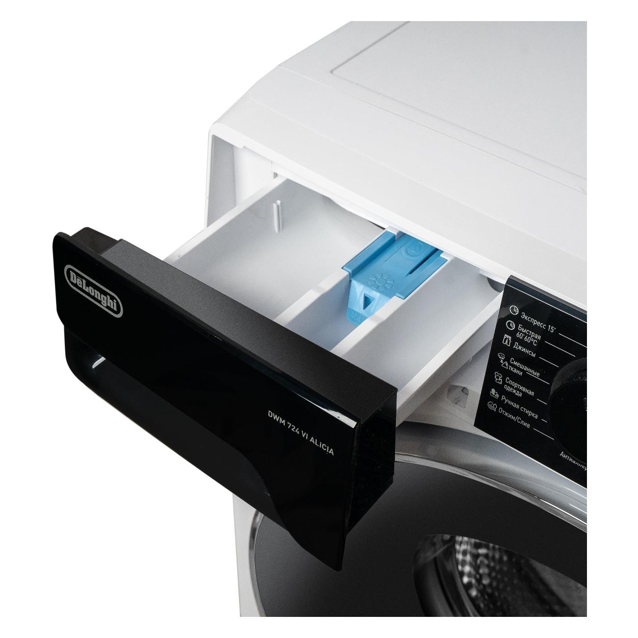 Стиральная машина DeLonghi DWM 724 VI Alicia оснащена барабаном, выполненным из нержавеющей стали. Уровень шума на протяжении отжима достигает 78 дБ, на протяжении стирки — 58 дБ. Встроен инверторный двигатель. Максимальная фронтальная загрузка составляет 7 кг, синтетики — 7 кг, шерсти — 5 кг. Устройство принадлежит к А классу стирки и В классу отжима. Скорость отжима настраивается и не превышает 1200 об/мин. Прибор дополнен ускоренным циклом, неполной загрузкой и отсрочкой запуска до 24 ч. Звуковой сигнал оповещает об окончании стирки.