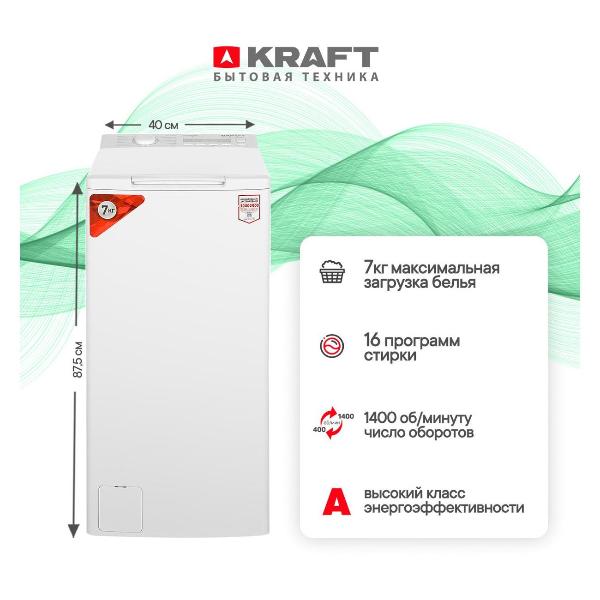 Стиральная машина Kraft TCH-UME7201W с вертикальной загрузкой имеет вместительный барабан, что позволяет за один цикл очистить до 7 кг сухого белья. Для комфортного использования в модели предусмотрена функция добавления одежды во время стирки. Устройство оснащено 16 программами, поэтому способно деликатно ухаживать за тканями любого типа. Режим предварительной стирки помогает удалить стойкие загрязнения. Дополнительное полоскание предназначено для тщательного вымывания порошка из материала.