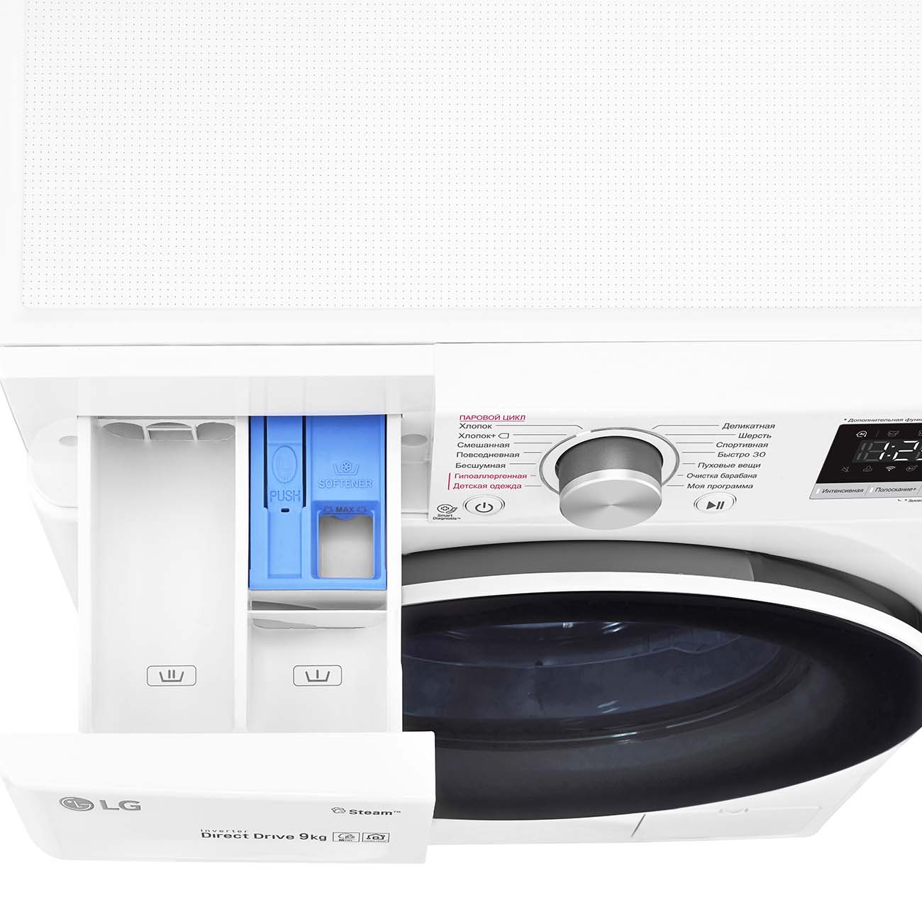 Стиральная машина LG AIDD F4V5VS0W оснащена системой самодиагностики: при возникновении неполадок на дисплей будет выведено соответствующее символьное значение.