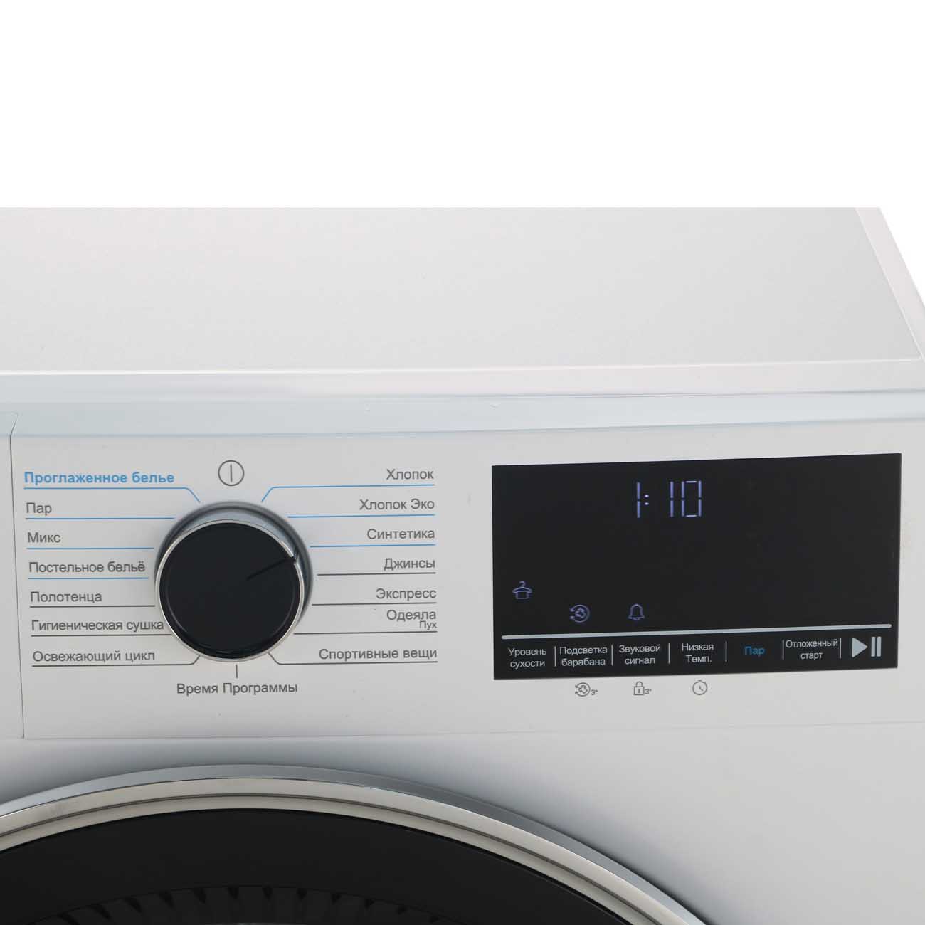 Весь конденсат, который скапливается в процессе сушки, собирается в отдельный контейнер. Уровень шума устройства составляет не более 64 дБ. Встроен таймер, при помощи которого можно отсрочить время запуска на срок до 24 ч. По окончании работы машина издает звуковой сигнал. Всего доступно 15 рабочих программ. Барабан объемом 110 л выполнен из нержавеющей стали.