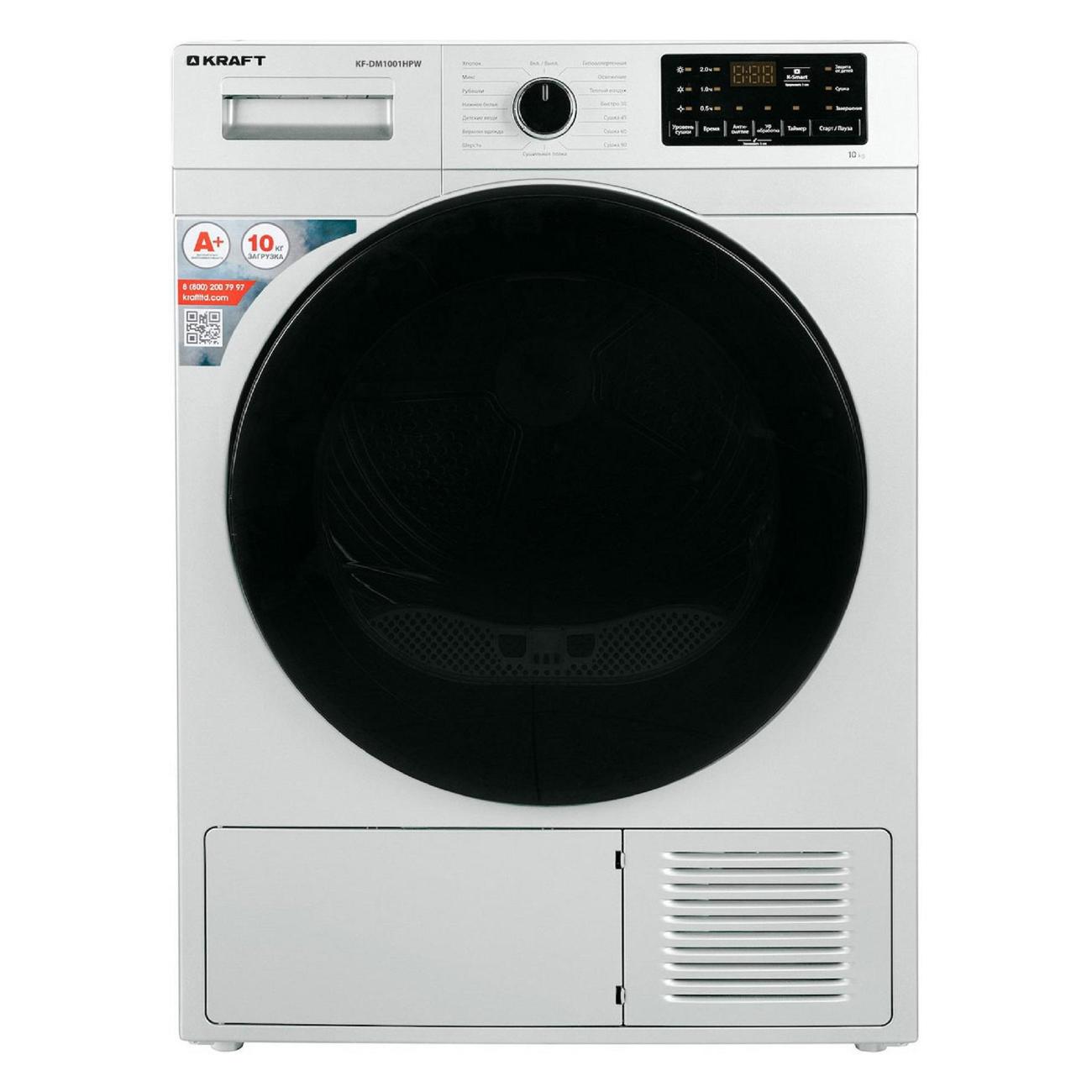 Сушильная машина Kraft KF-DM1001HPW обладает цифровым дисплеем, на котором отображается время до конца работы и другая информация. Модель имеет режимы для бережной сушки джинсов и одежды из шерсти. Встроенная лампа осуществляет подсветку внутреннего пространства. Барабан изготавливается из нержавеющей стали, устойчивой к окислению и процессу коррозии. Заблокировать панель управления позволяет функция «Защита от детей». Устройство относится к классу энергоэффективности А и потребляет за цикл сушки 1,12 кВт*ч.