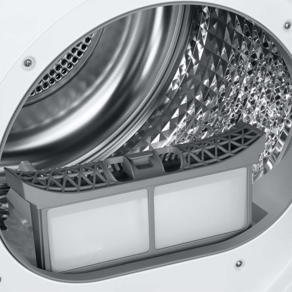 Для управления есть сенсорный символьный дисплей, на экран которого выводится символьное обозначение хода программы. Благодаря этому пользователь может отслеживать примерное время до окончания цикла. В арсенале сушильной машины Samsung DV90T5240AT есть самодиагностика неисправностей. При выявлении ошибки в работе устройства на экран дисплея будет выведен соответствующий знак. Бак устройства изготовлен из нержавеющей стали. Материал характеризуется значительной прочностью, не подвержен механическому и температурному воздействию, а также деформации и образованию коррозионного налета. За счет этого бак имеет продолжительный срок службы.